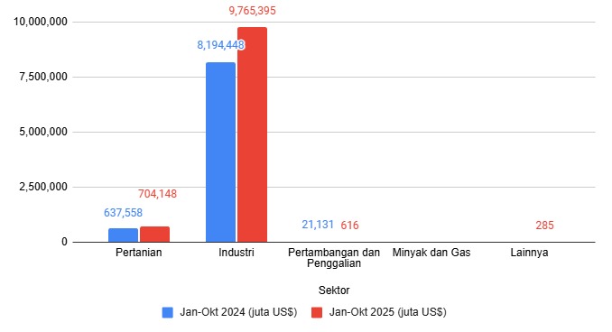 Performa ekspor bulanan juga turut memperkuat tren positif ini. Khusus pada bulan Oktober 2025, nilai ekspor dari Sumut tercatat sebesar US$1.176,97 juta. Angka ini jauh lebih tinggi dibandingkan dengan nilai ekspor pada Oktober 2024, yang saat itu berada di posisi US$1.037,39 juta.