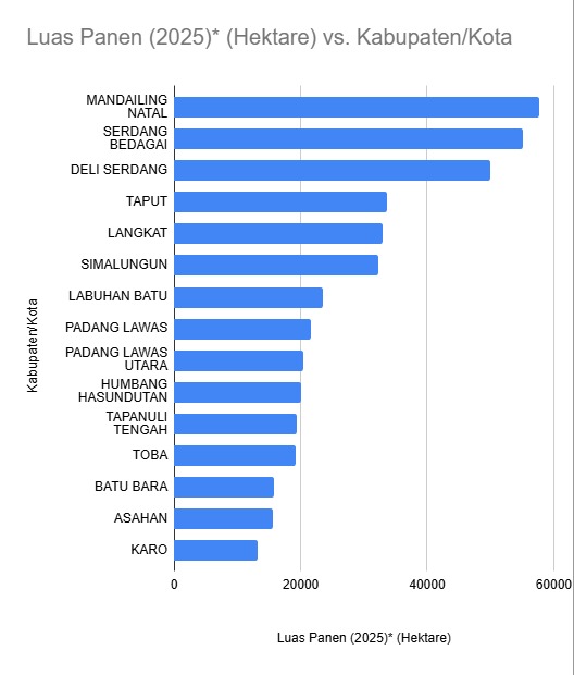 - Deli Serdang: tetap menjadi salah satu daerah dengan luas panen terbesar, meskipun terjadi penurunan kecil sebesar 238 hektare atau kurang dari 1 persen.